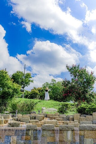 神明公園にある流れるこの池は、夏は子供たちに人気のスポットだという。白いワンピース姿の少女が空を見あげている。アニメのようなストーリー性を感じさせる写真である。